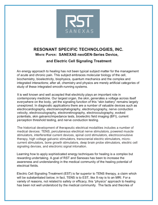 SANEXAS Electric Cell Signaling Machine uses electrical signals to treat pain and circulatory conditions. This electric cell signaling device is much like a traditional TENS unit, but it is larger in size and penetrates deeper which is more effective in reducing pain. The pharmaceutical strength, frequencies, and associated harmonics are greater than the typical TENS unit, which is why trained medical professionals are present when it is in use.